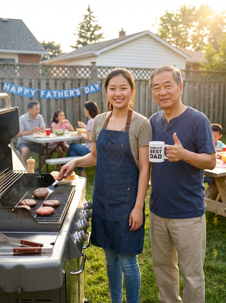 model at BBQ grill, Fathers Day cookout, grilling apron, backyard party setting, proud dad moment