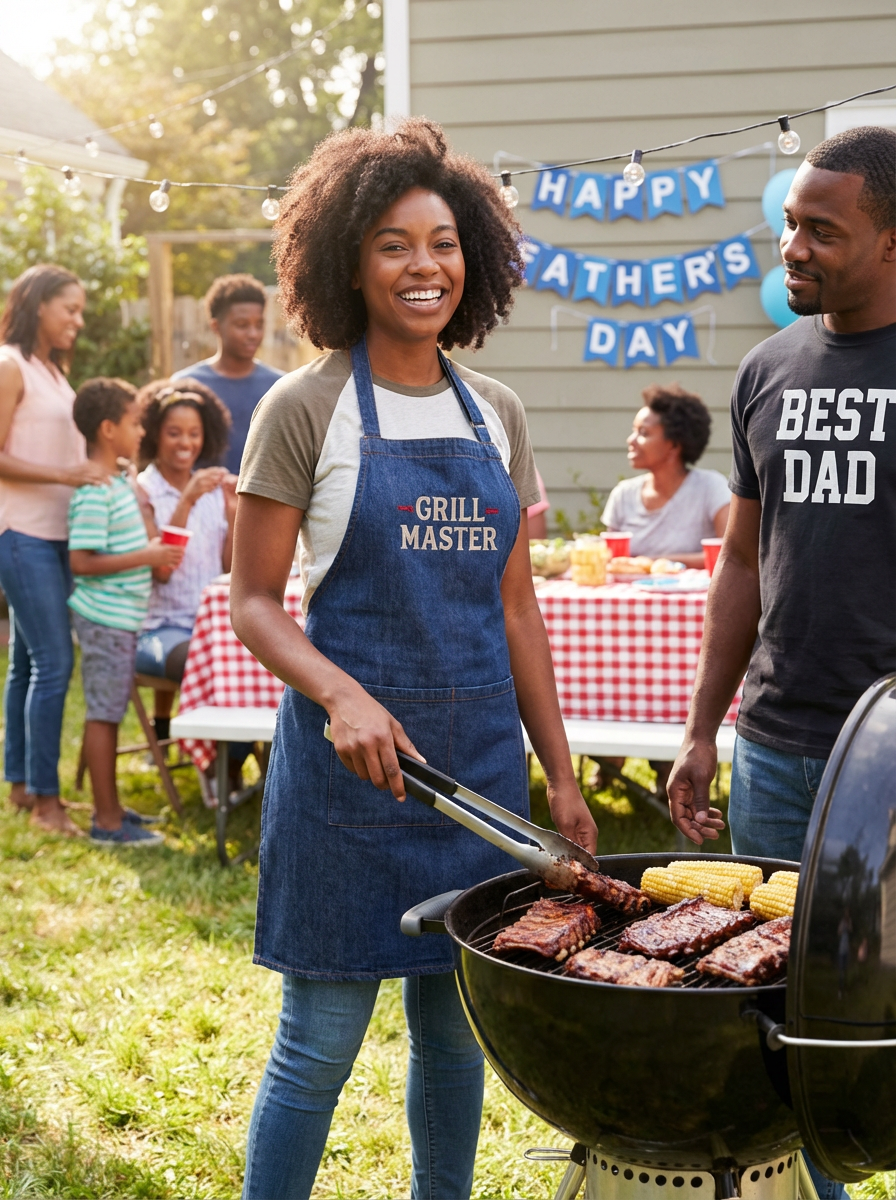 model at BBQ grill, Fathers Day cookout, grilling apron, backyard party setting, proud dad moment