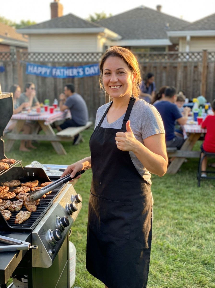 model at BBQ grill, Fathers Day cookout, grilling apron, backyard party setting, proud dad moment