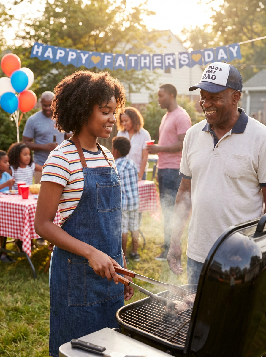 model at BBQ grill, Fathers Day cookout, grilling apron, backyard party setting, proud dad moment