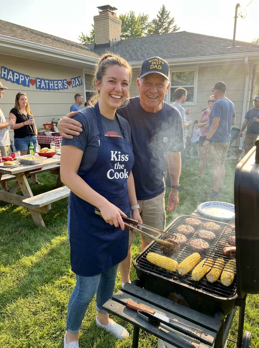 model at BBQ grill, Fathers Day cookout, grilling apron, backyard party setting, proud dad moment