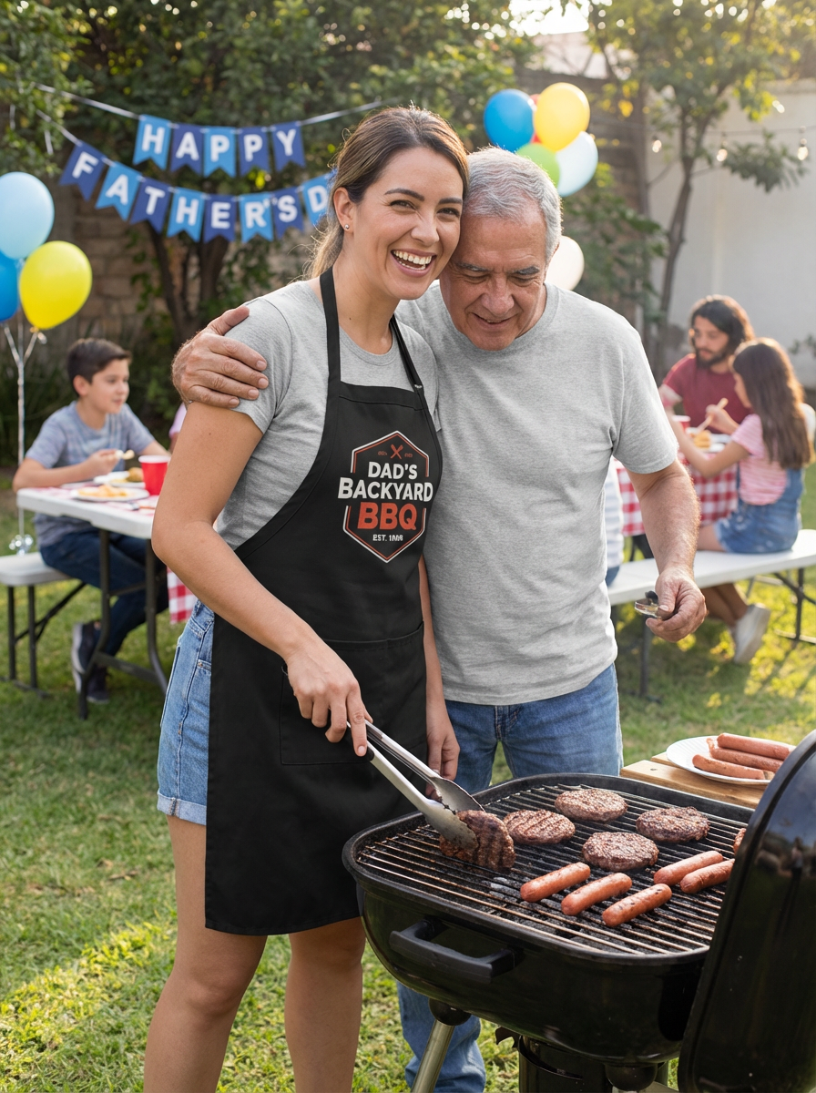 model at BBQ grill, Fathers Day cookout, grilling apron, backyard party setting, proud dad moment