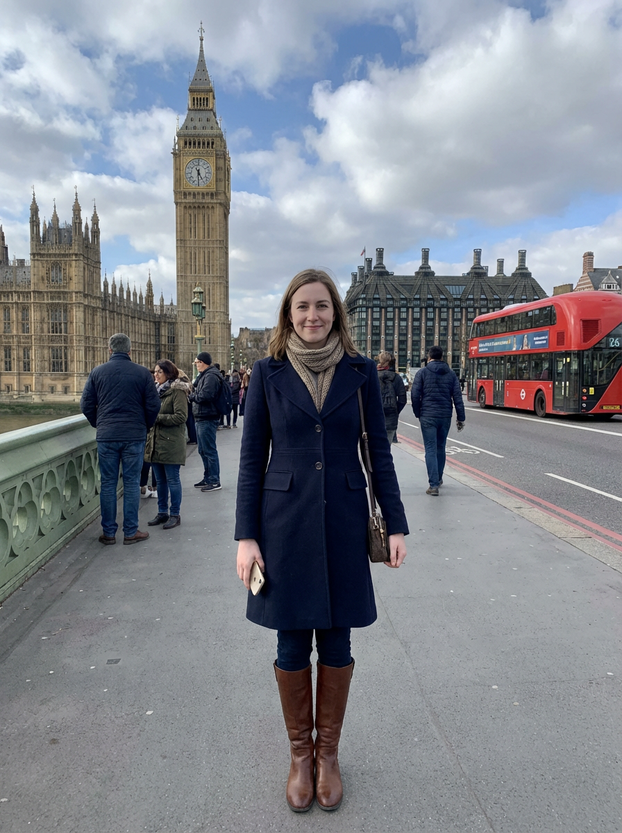model at Big Ben and Westminster, iconic London backdrop, elegant coat and boots , classic tourist shot