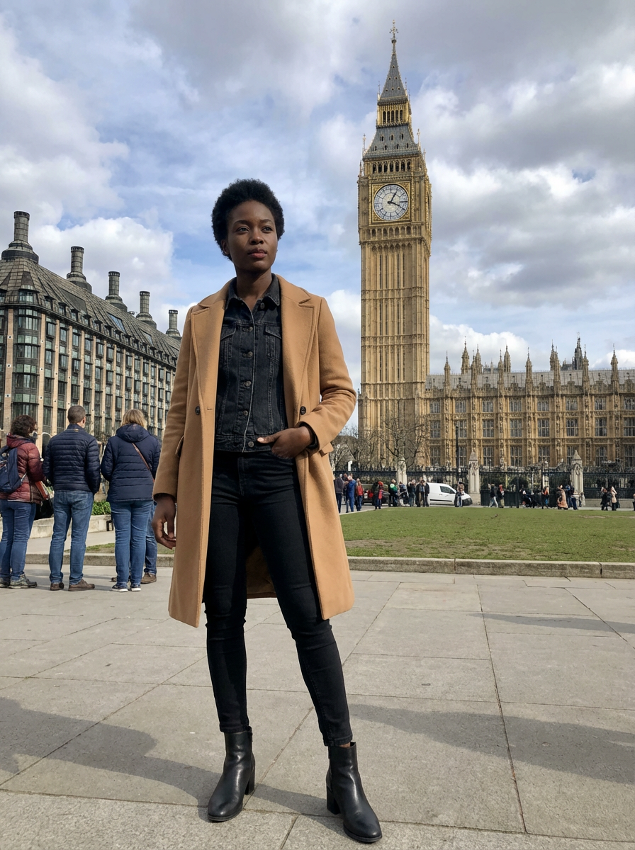model at Big Ben and Westminster, iconic London backdrop, elegant coat and boots , classic tourist shot