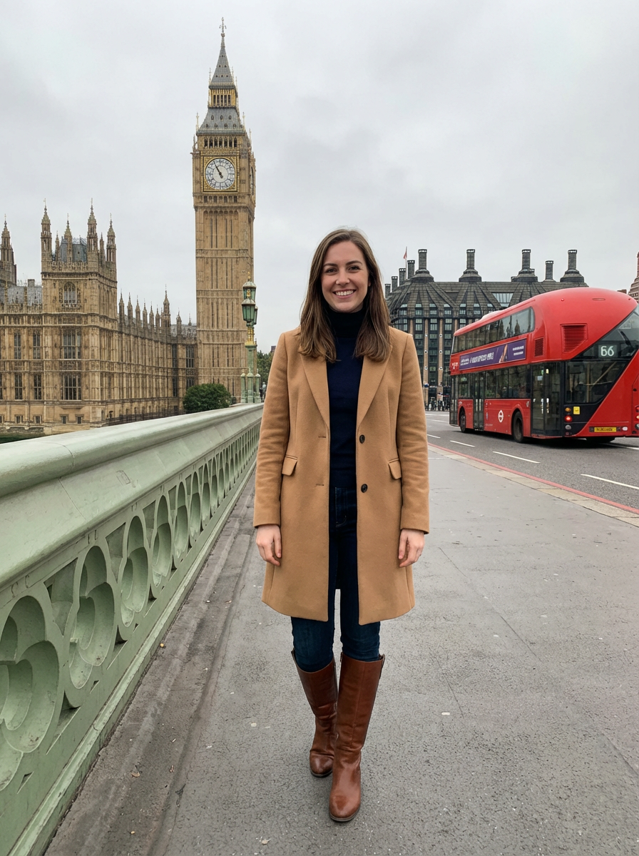 model at Big Ben and Westminster, iconic London backdrop, elegant coat and boots , classic tourist shot