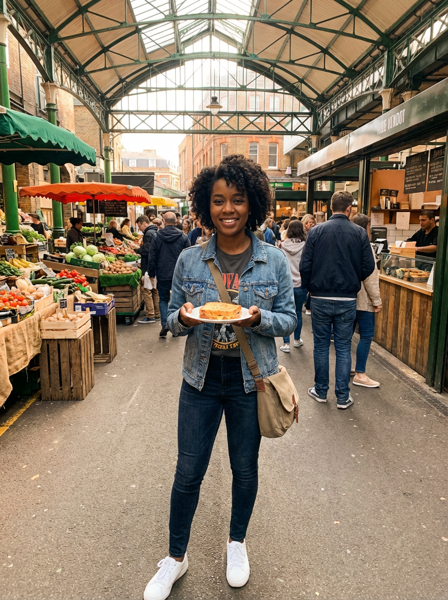 model at Borough Market, foodie scene, casual stylish outfit, vibrant market atmosphere