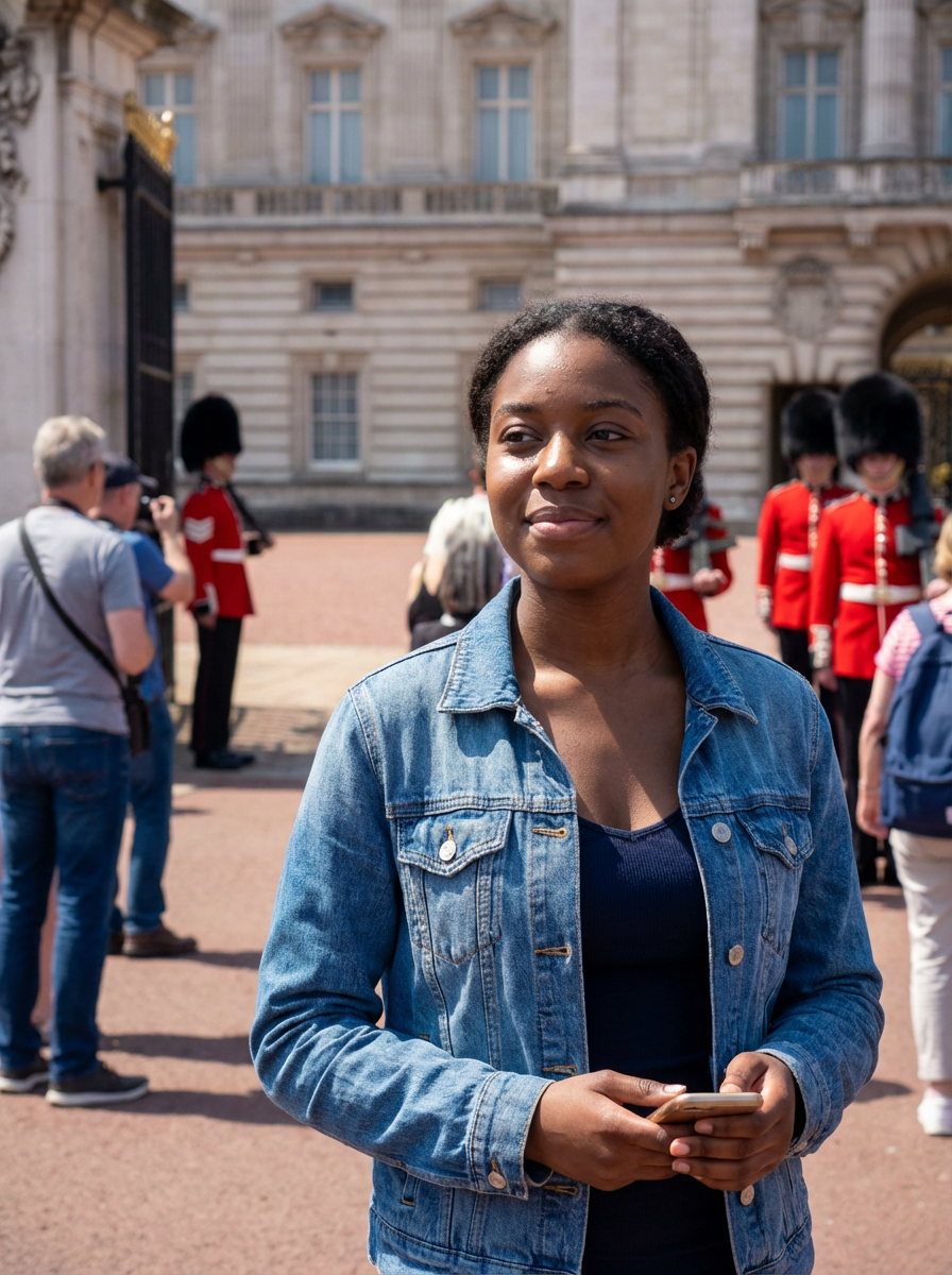 model at Buckingham Palace, royal guards visible, elegant tourist attire, sunny London day