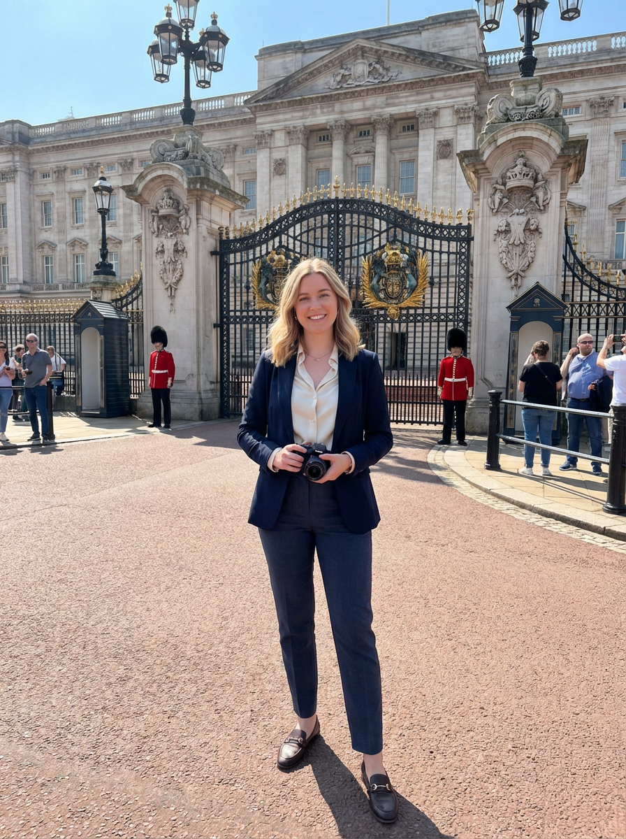 model at Buckingham Palace, royal guards visible, elegant tourist attire, sunny London day