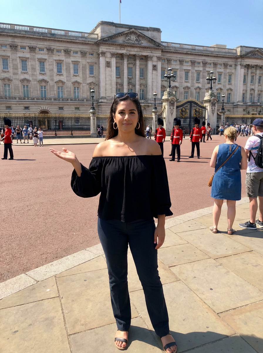 model at Buckingham Palace, royal guards visible, elegant tourist attire, sunny London day