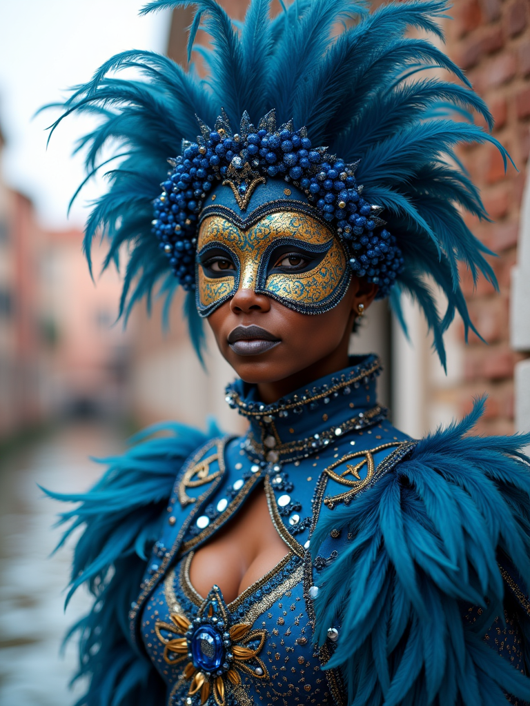 model at Carnival in Venice, wearing a dazzling blue and gold masquerade outfit with star-spangled feathers , surrounded by historic architecture and canals, embodying European cultural tradition