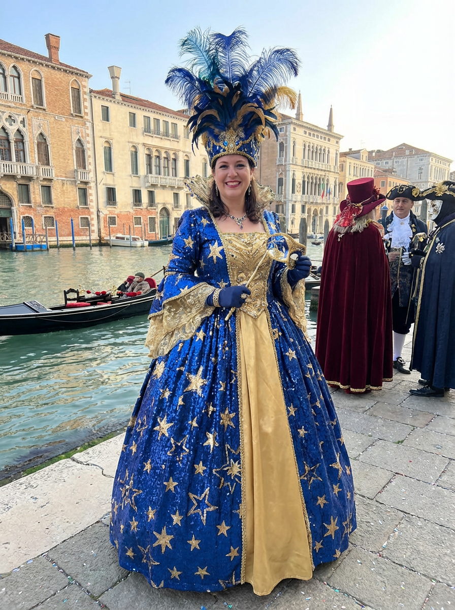 model at Carnival in Venice, wearing a dazzling blue and gold masquerade outfit with star-spangled feathers , surrounded by historic architecture and canals, embodying European cultural tradition