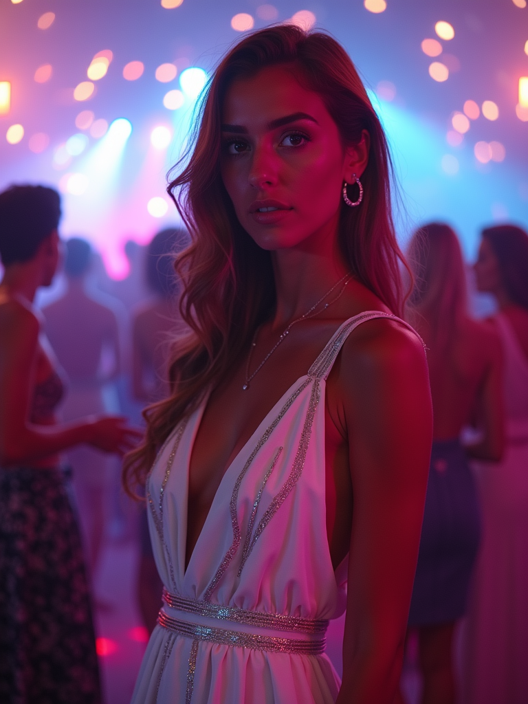 model at Cavo Paradiso nightclub, wearing a stunning white party dress with metallic details , colorful lights and dancing atmosphere