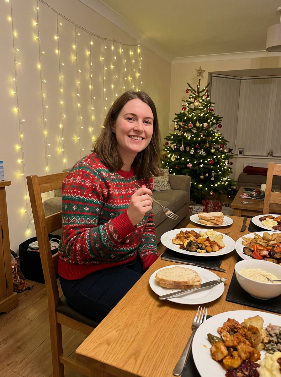 model at Christmas dinner wearing Christmas style clothes. Christmas tree in background. Christmas lights