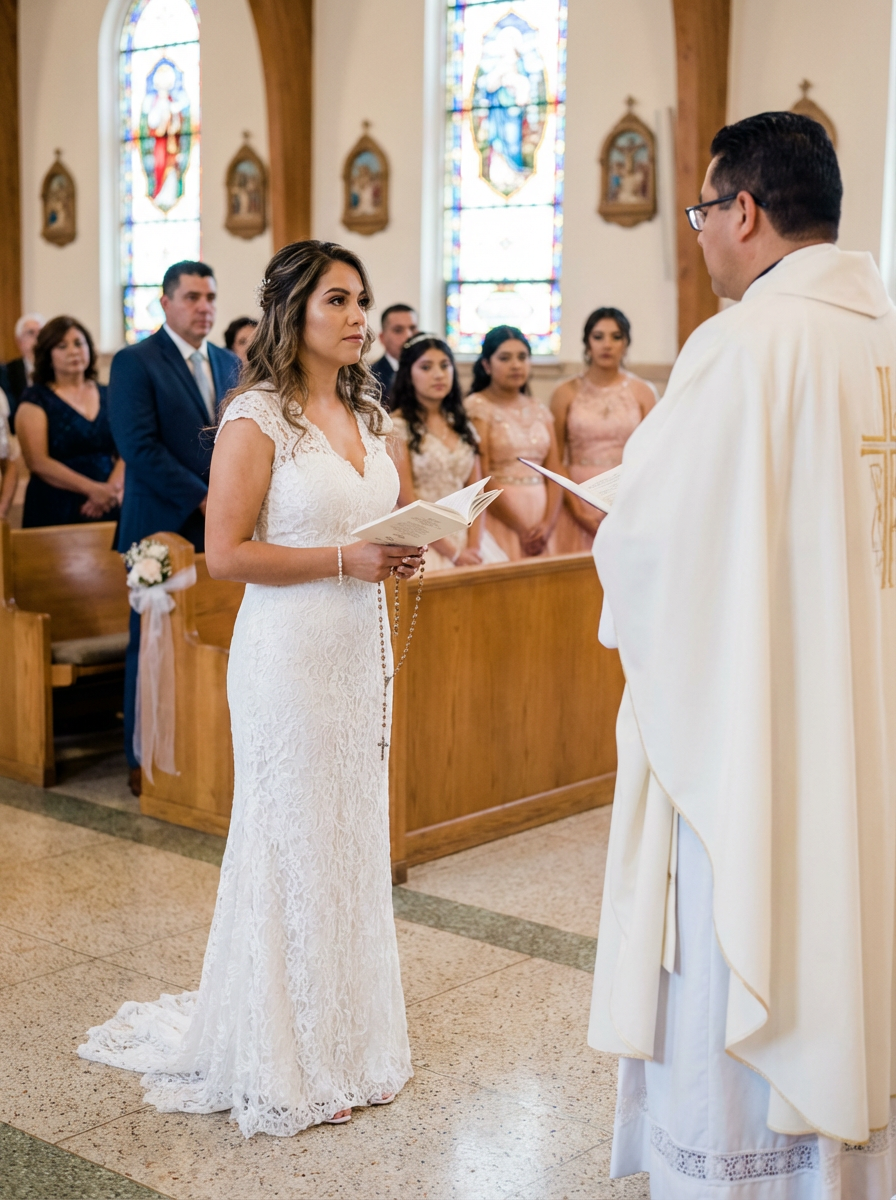 model at church for quinceanera blessing, traditional ceremony, beautiful dress, respectful sacred moment