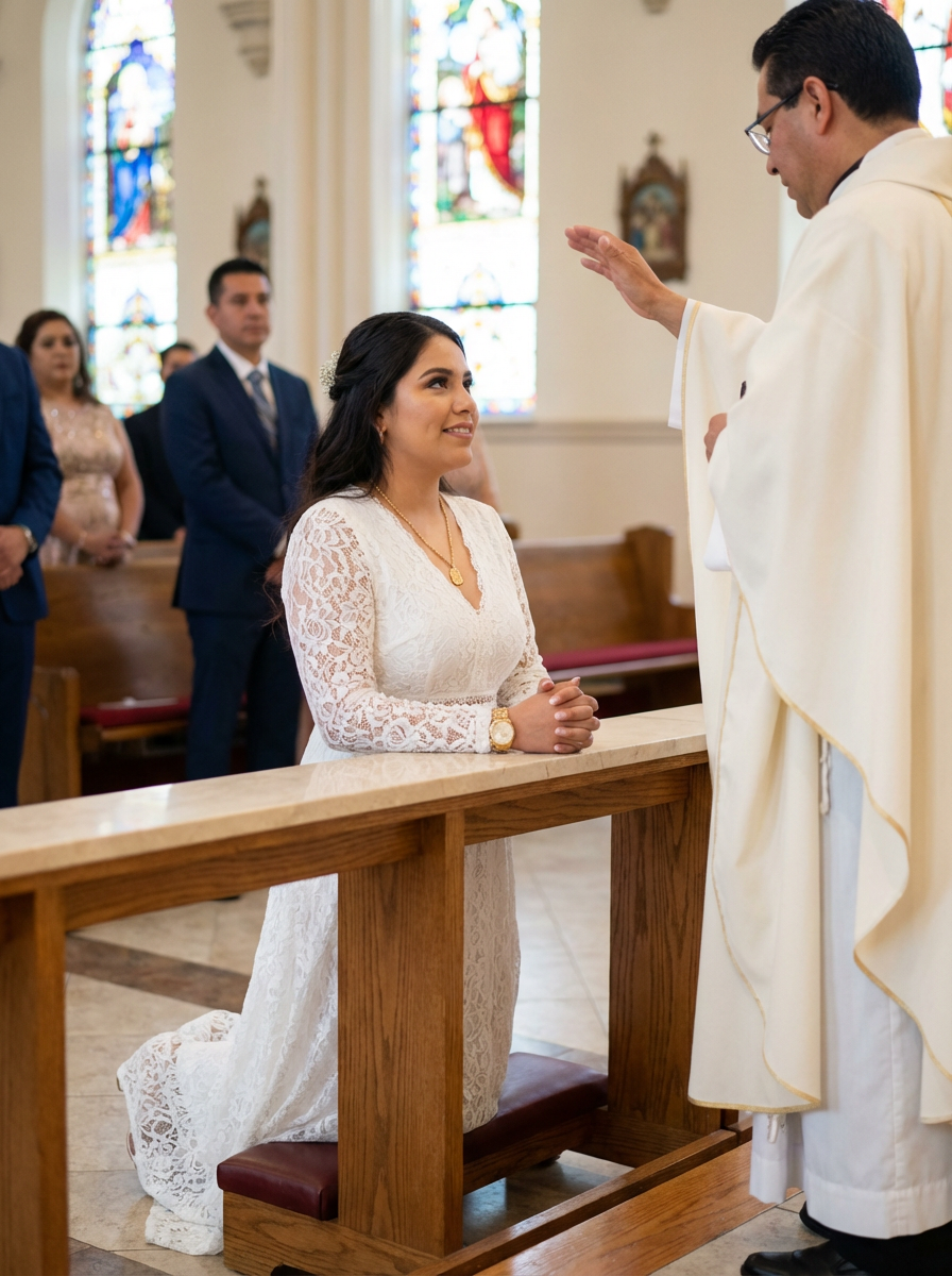 model at church for quinceanera blessing, traditional ceremony, beautiful dress, respectful sacred moment