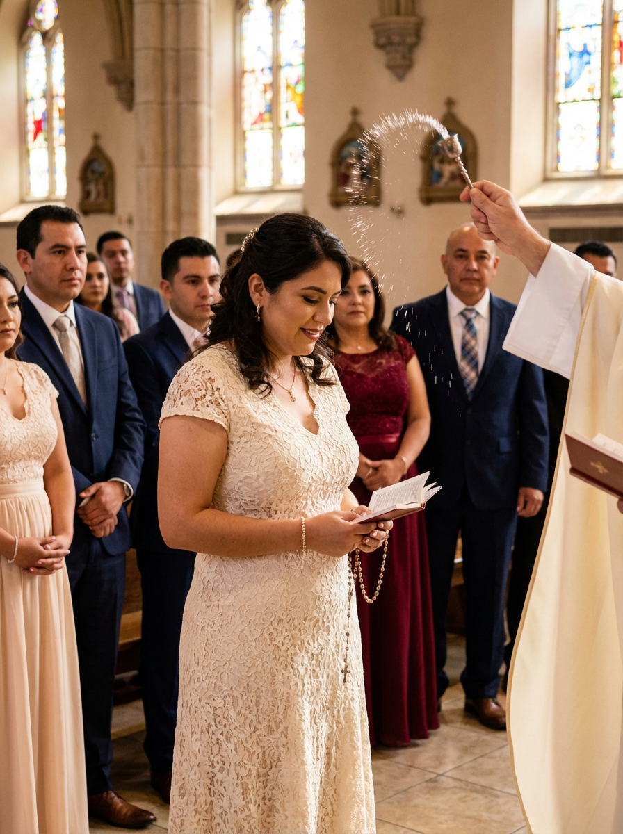 model at church for quinceanera blessing, traditional ceremony, beautiful dress, respectful sacred moment