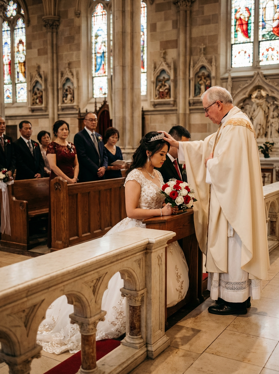 model at church for quinceanera blessing, traditional ceremony, beautiful dress, respectful sacred moment