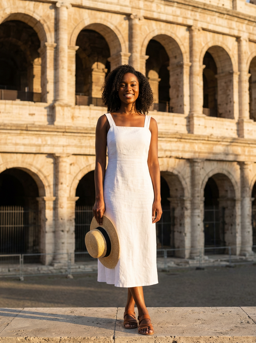 model at Colosseum Rome, ancient amphitheater backdrop, stylish Italian summer outfit, golden hour lighting