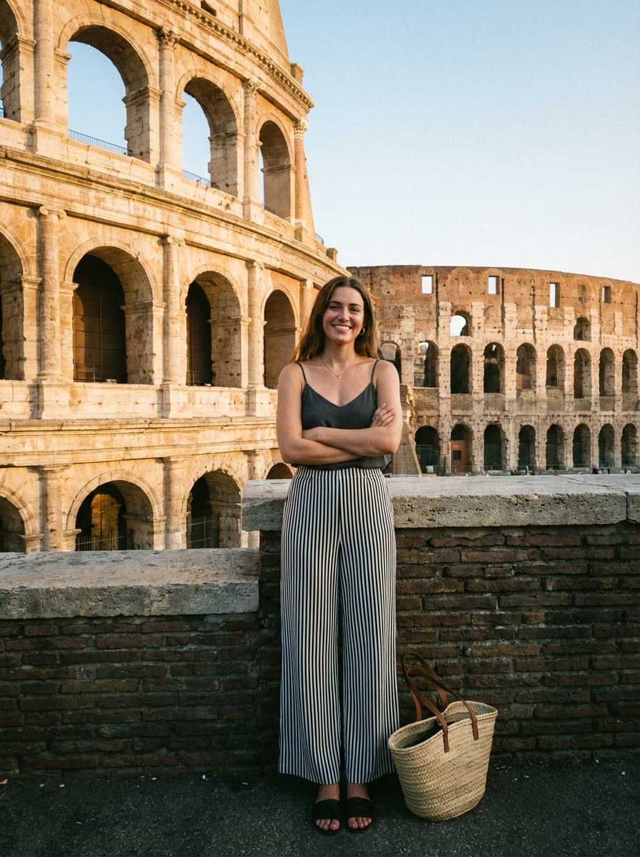 model at Colosseum Rome, ancient amphitheater backdrop, stylish Italian summer outfit, golden hour lighting