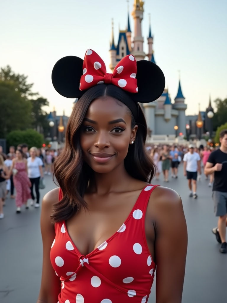 model at Disneyland Paris, wearing Mickey ears with cute Disney-themed outfit , castle in background