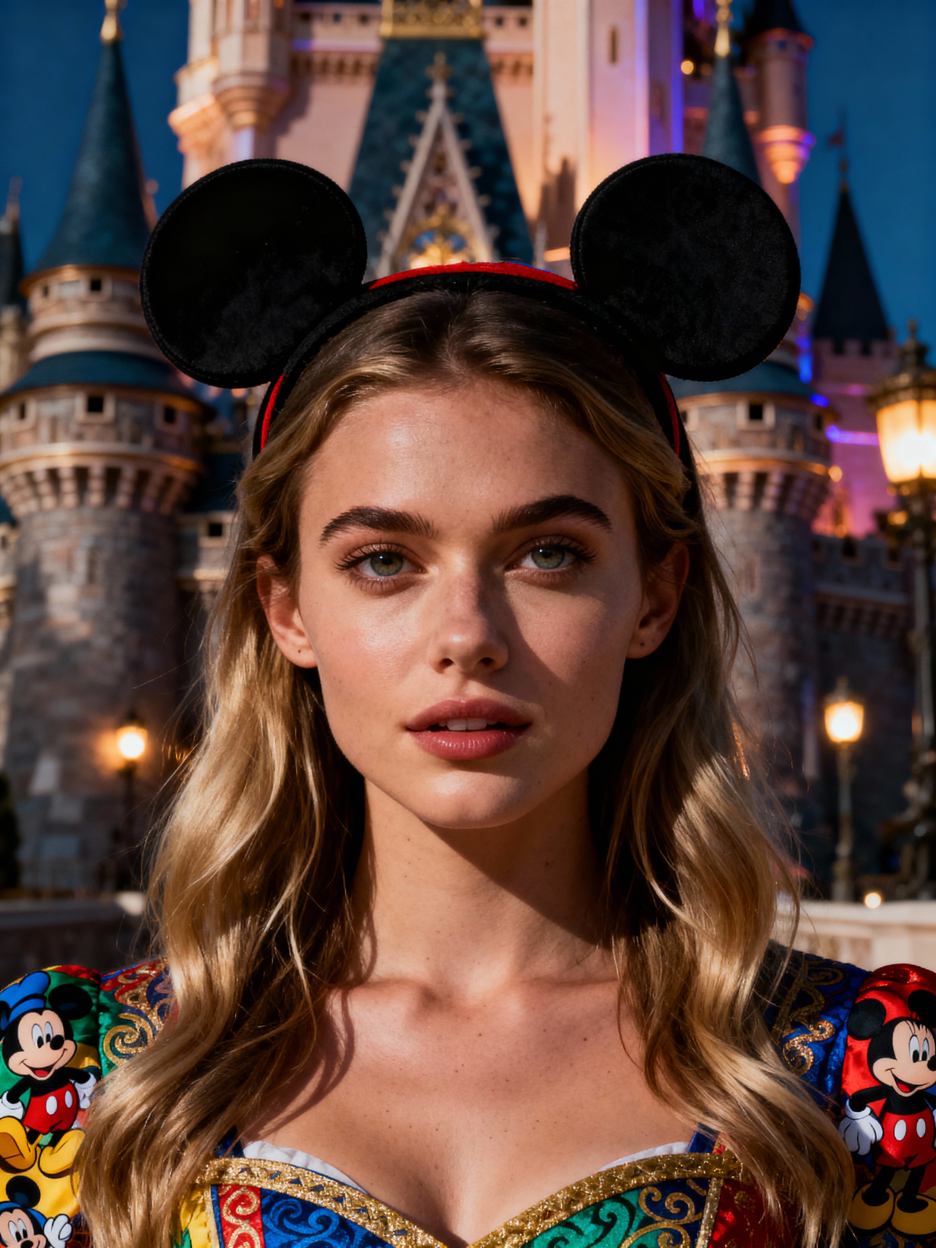 model at Disneyland Paris, wearing Mickey ears with cute Disney-themed outfit , castle in background