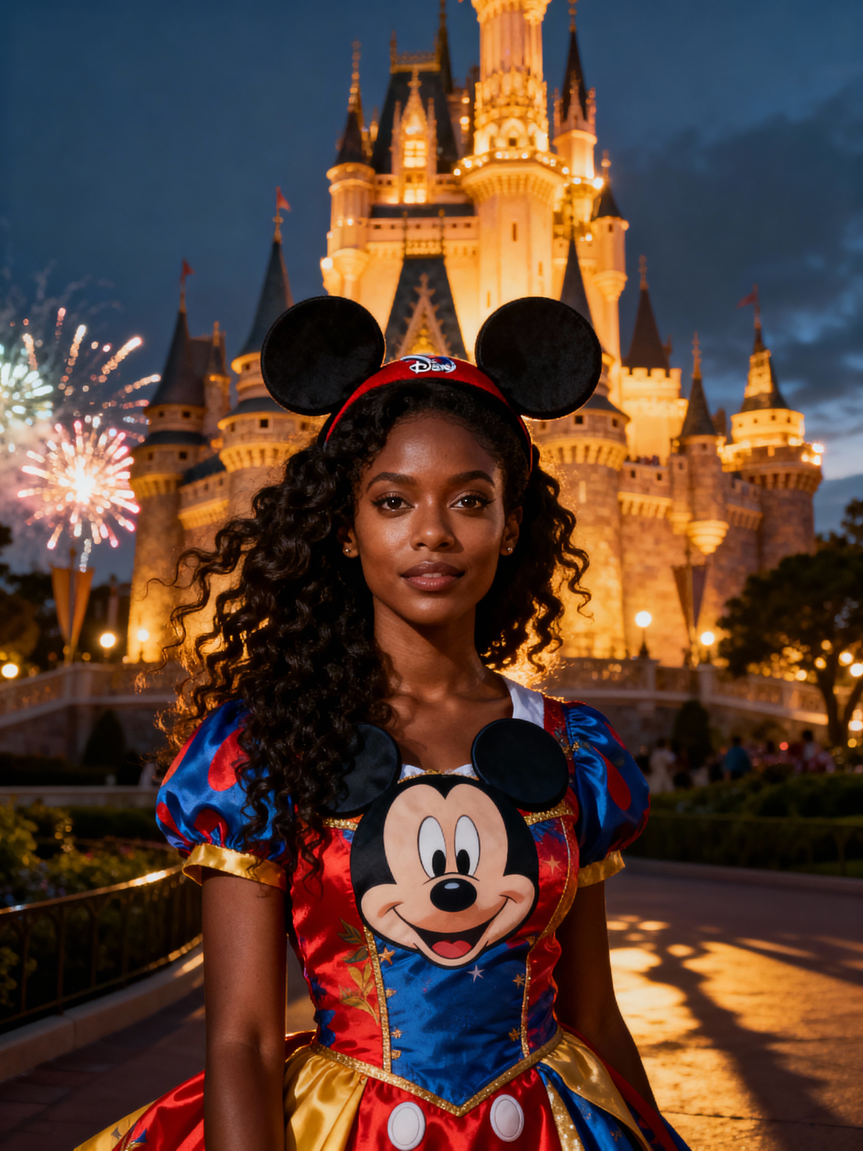 model at Disneyland Paris, wearing Mickey ears with cute Disney-themed outfit , castle in background
