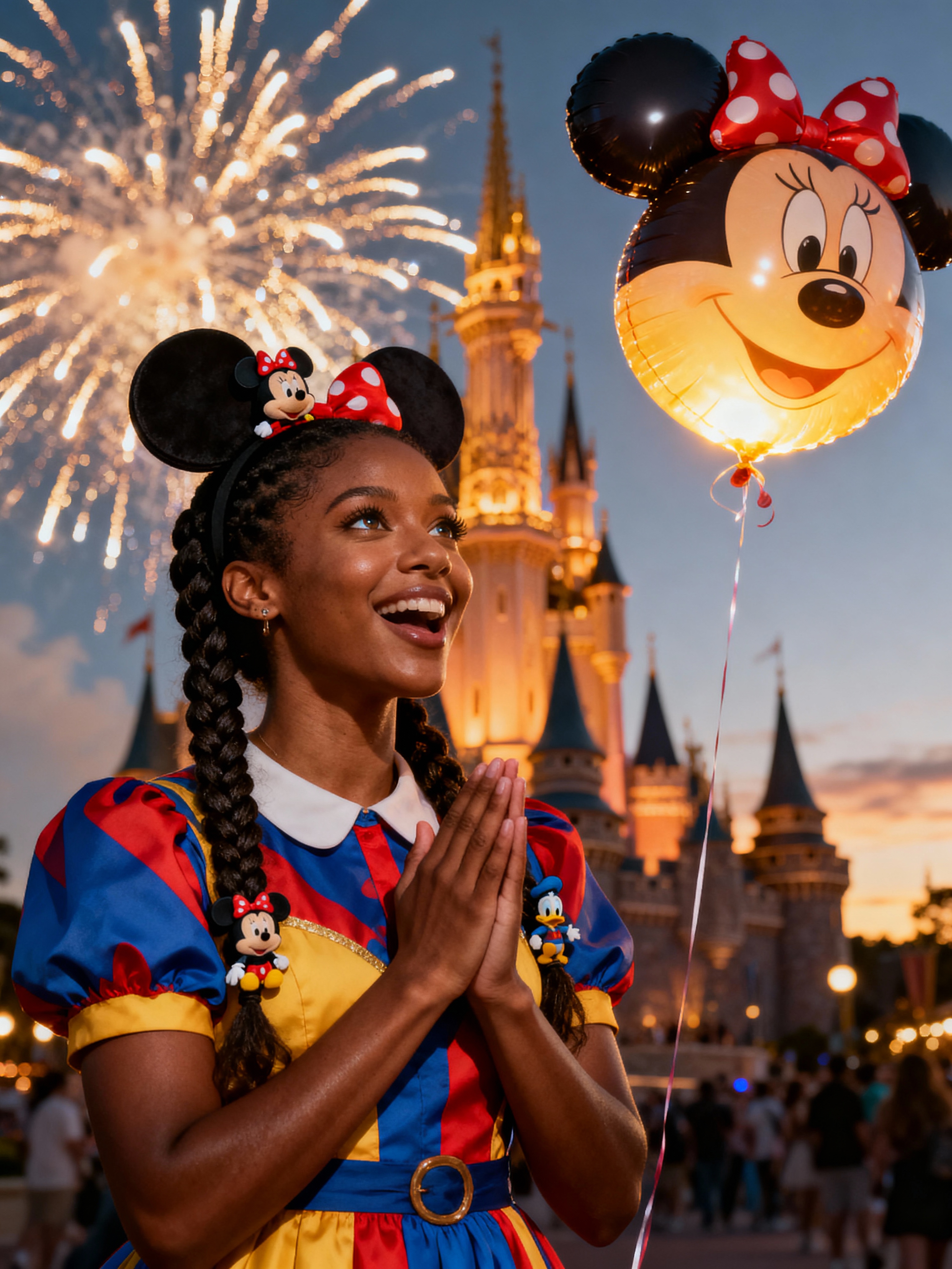 model at Disneyland Paris, wearing Mickey ears with cute Disney-themed outfit , castle in background