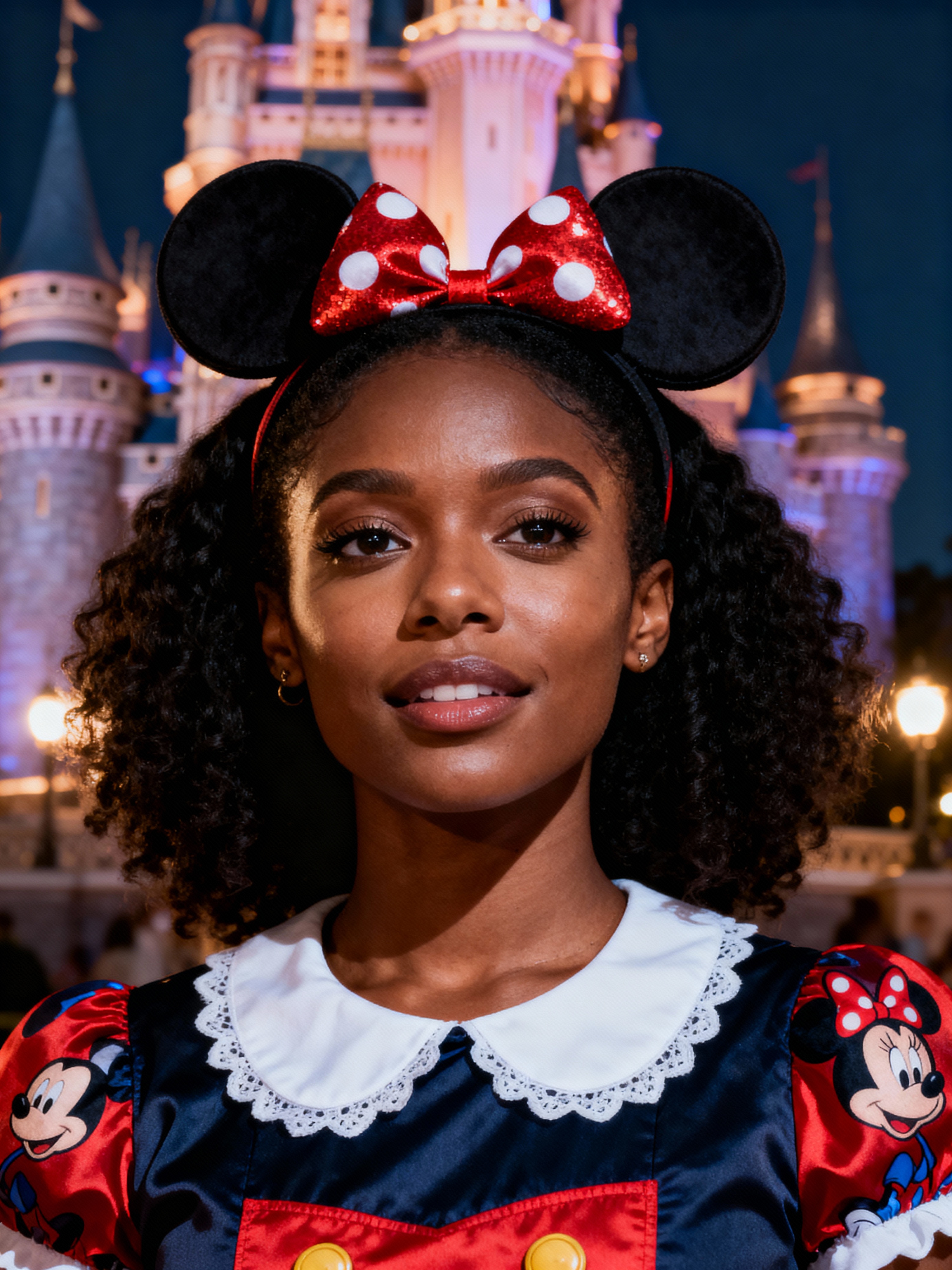 model at Disneyland Paris, wearing Mickey ears with cute Disney-themed outfit , castle in background