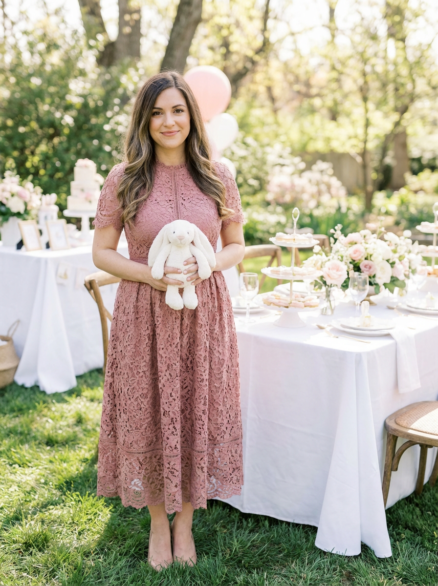 model at elegant baby shower brunch, sophisticated table setting, garden party aesthetic