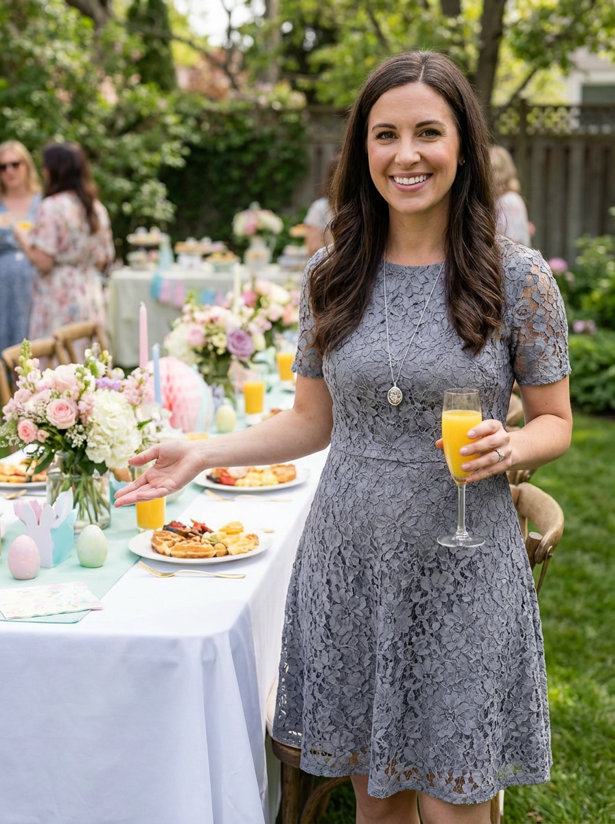 model at elegant baby shower brunch, sophisticated table setting, garden party aesthetic