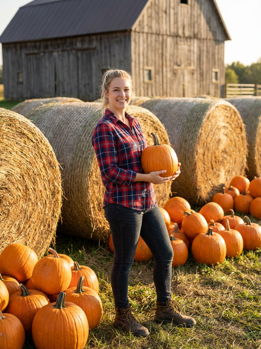 model at farm harvest scene, hay bales and pumpkins, flannel shirt, rustic autumn setting