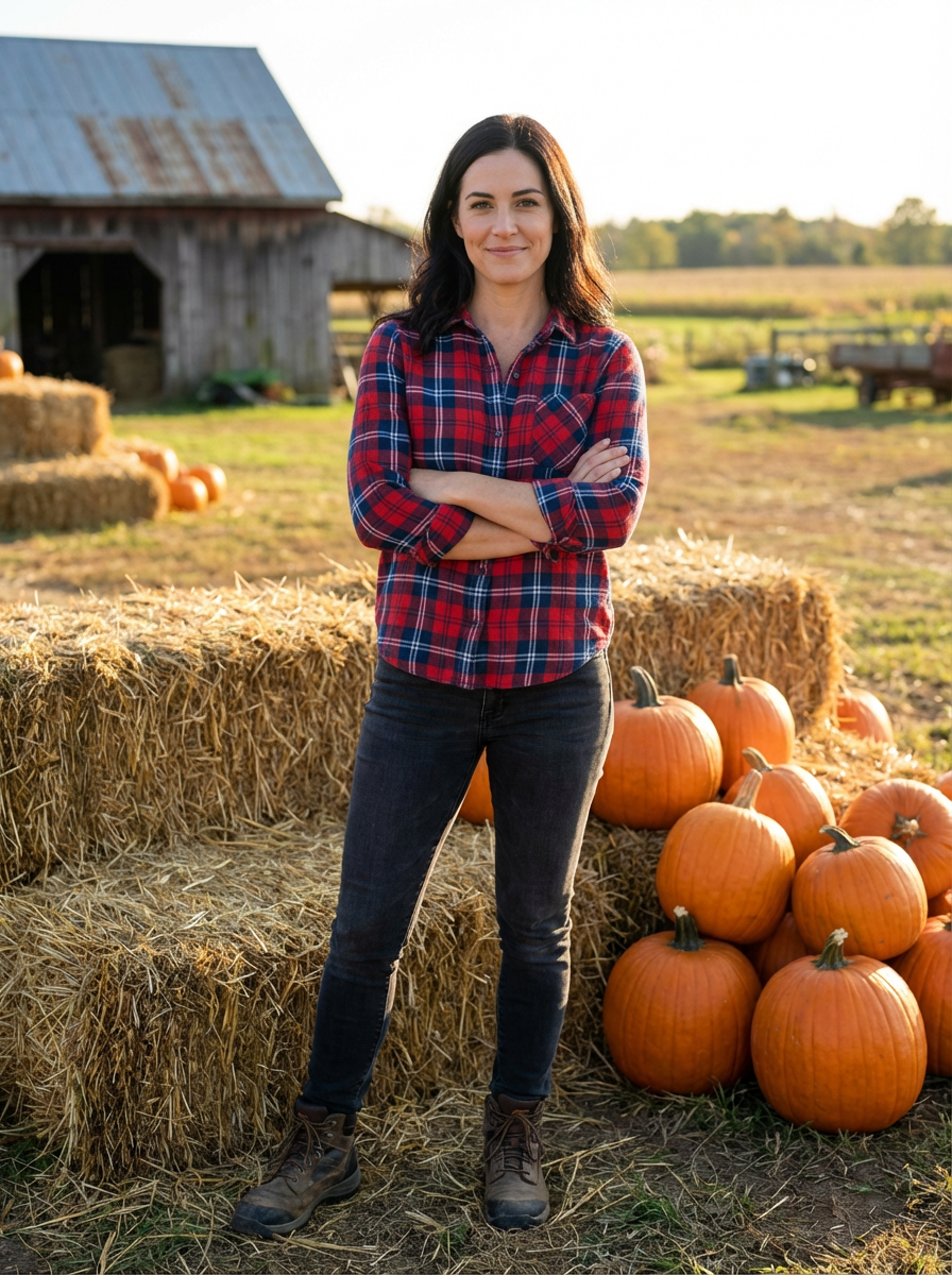 model at farm harvest scene, hay bales and pumpkins, flannel shirt, rustic autumn setting