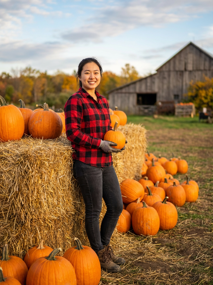 model at farm harvest scene, hay bales and pumpkins, flannel shirt, rustic autumn setting