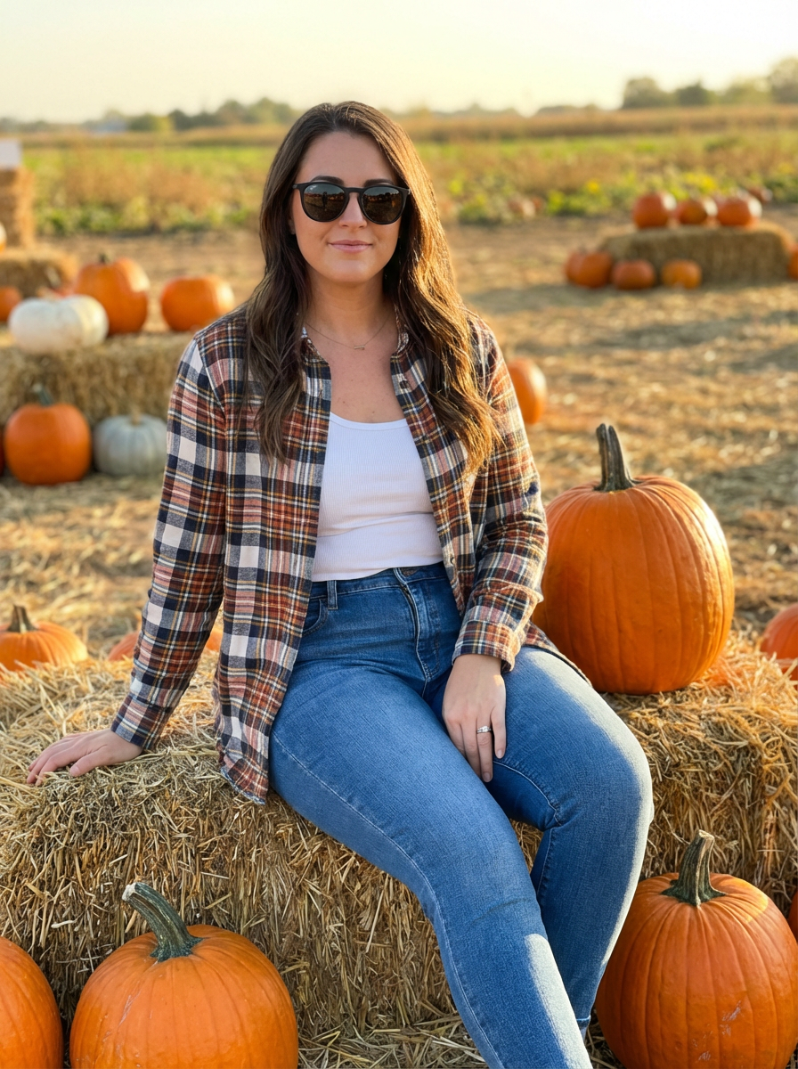 model at farm harvest scene, hay bales and pumpkins, flannel shirt, rustic autumn setting