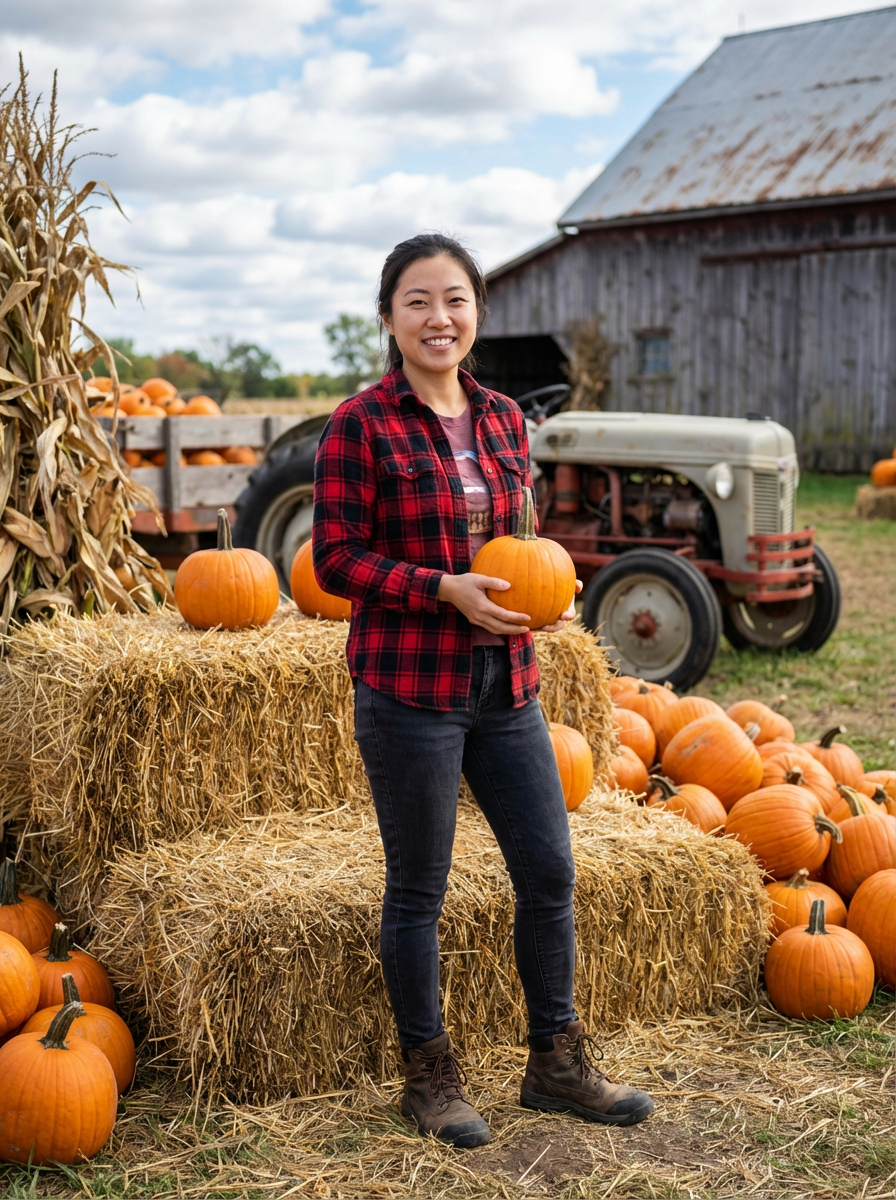model at farm harvest scene, hay bales and pumpkins, flannel shirt, rustic autumn setting