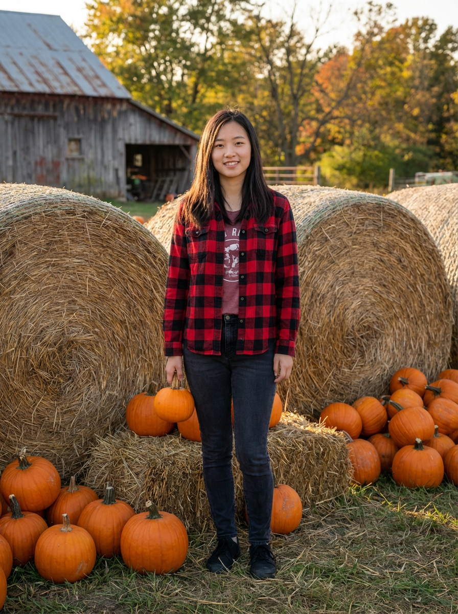 model at farm harvest scene, hay bales and pumpkins, flannel shirt, rustic autumn setting