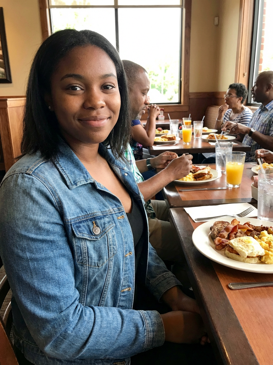 model at Fathers Day brunch, restaurant setting, family gathering, smart casual attire
