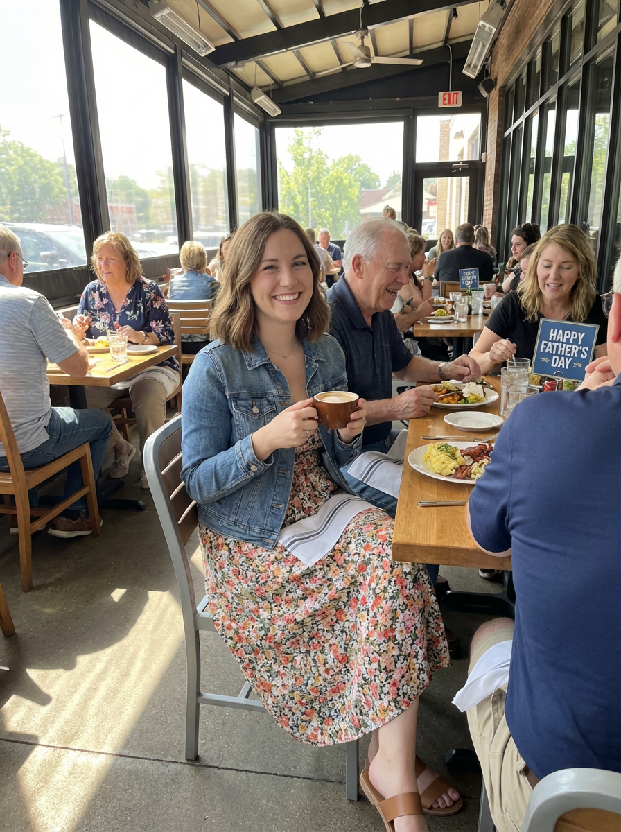 model at Fathers Day brunch, restaurant setting, family gathering, smart casual attire