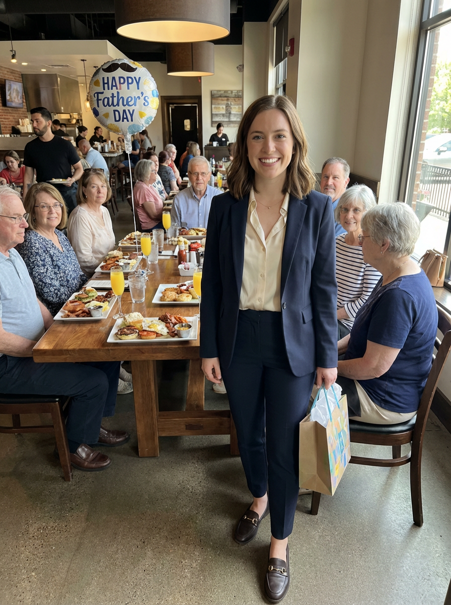model at Fathers Day brunch, restaurant setting, family gathering, smart casual attire