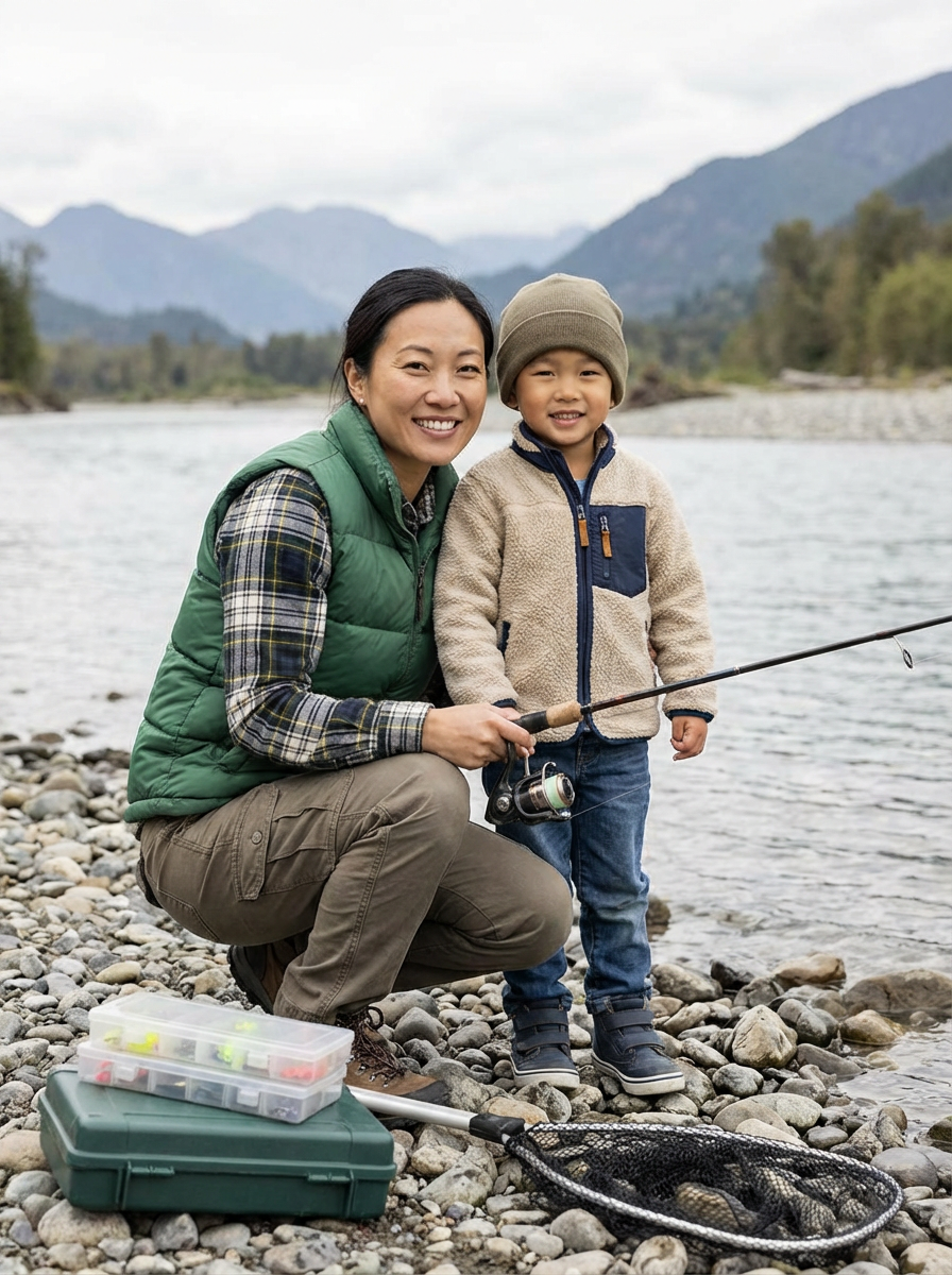 model at fishing spot, father-child bonding, casual outdoor gear, lake or river setting