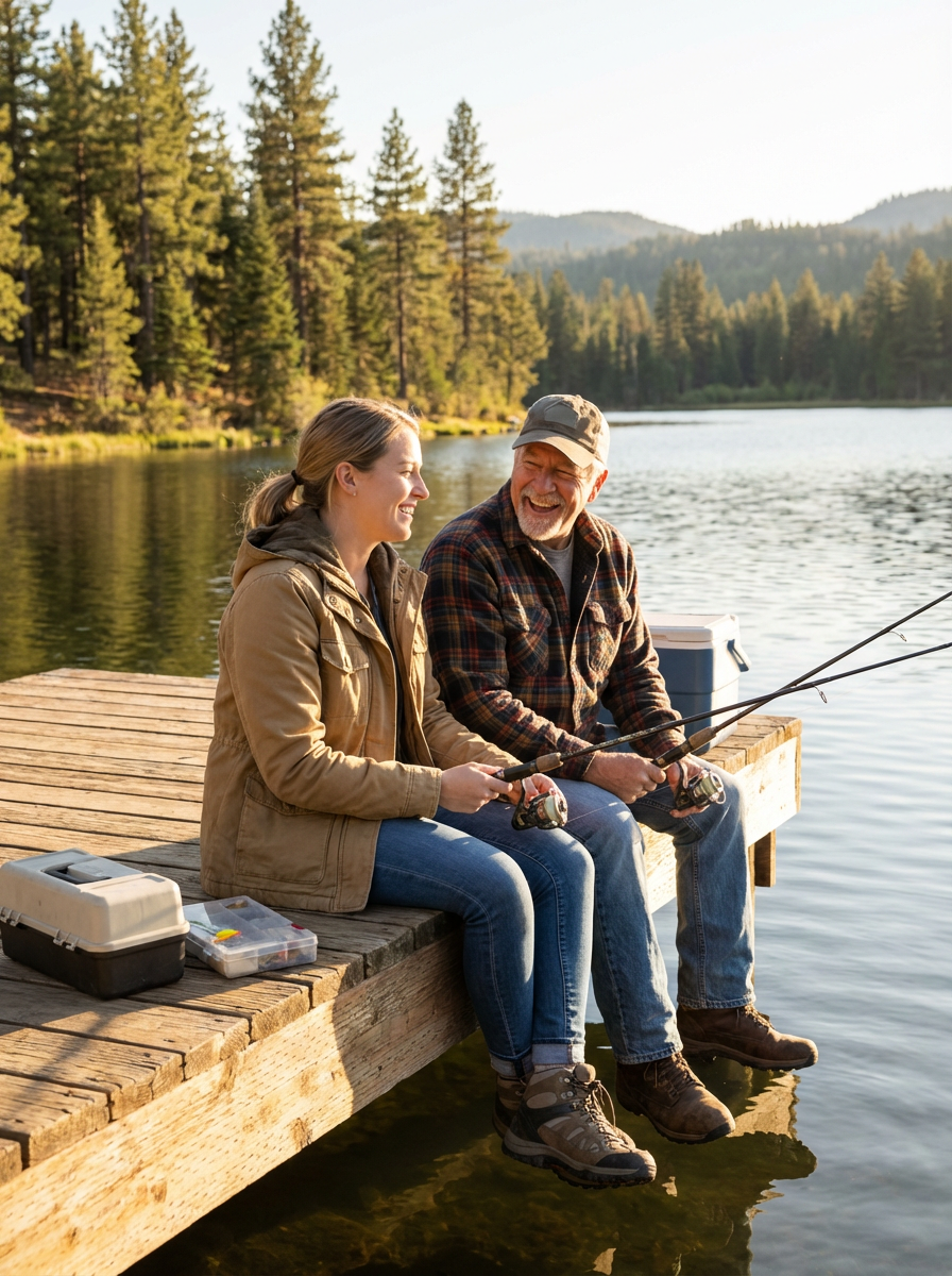 model at fishing spot, father-child bonding, casual outdoor gear, lake or river setting