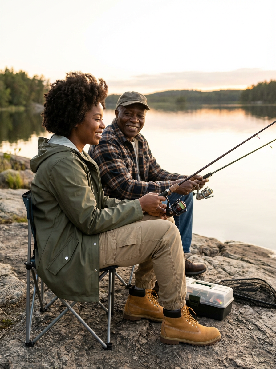 model at fishing spot, father-child bonding, casual outdoor gear, lake or river setting