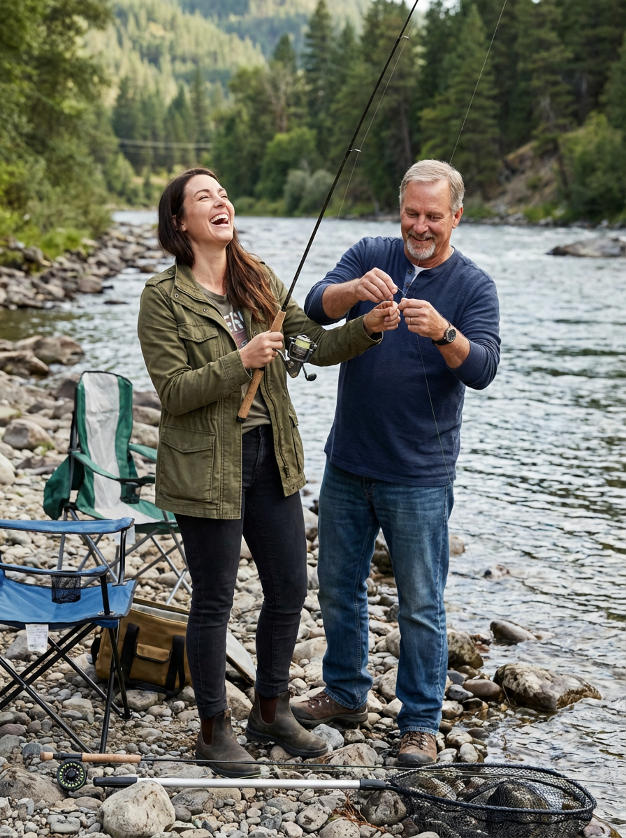 model at fishing spot, father-child bonding, casual outdoor gear, lake or river setting