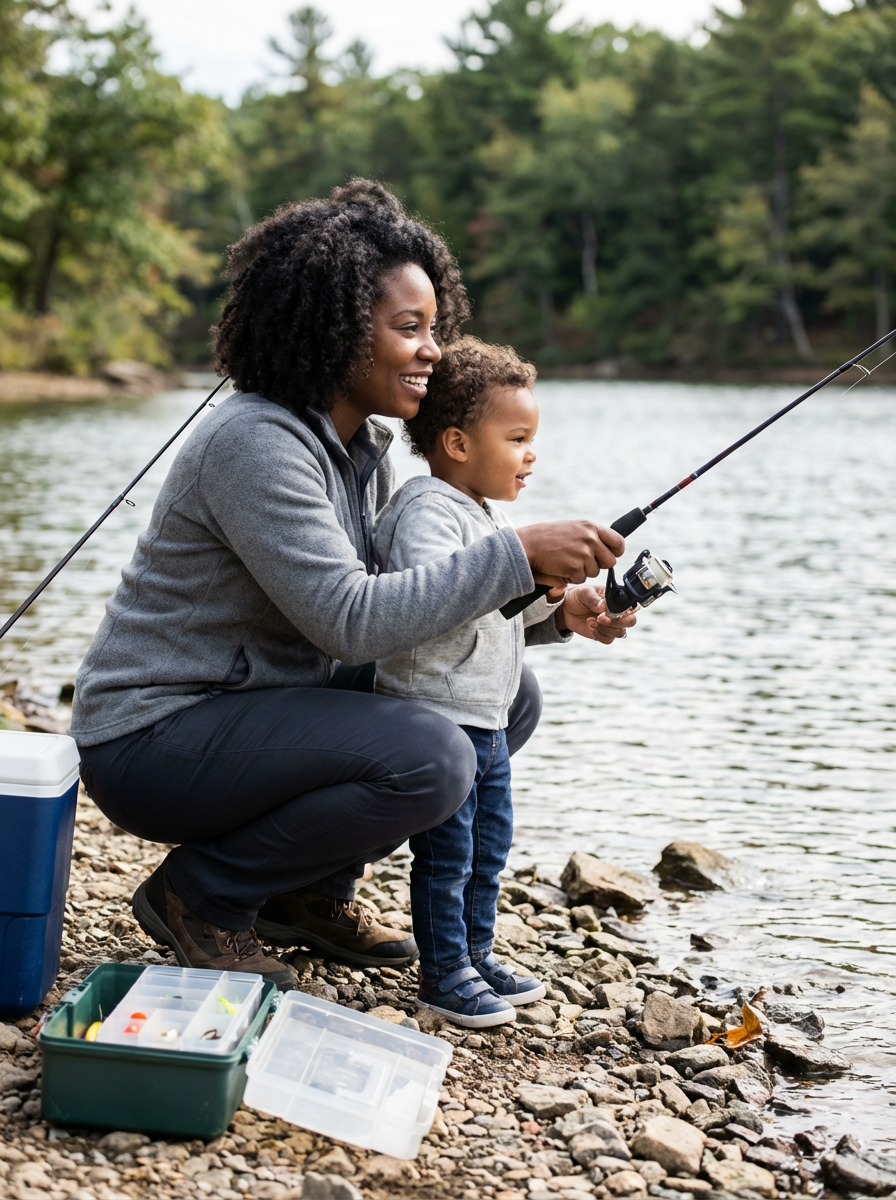 model at fishing spot, father-child bonding, casual outdoor gear, lake or river setting