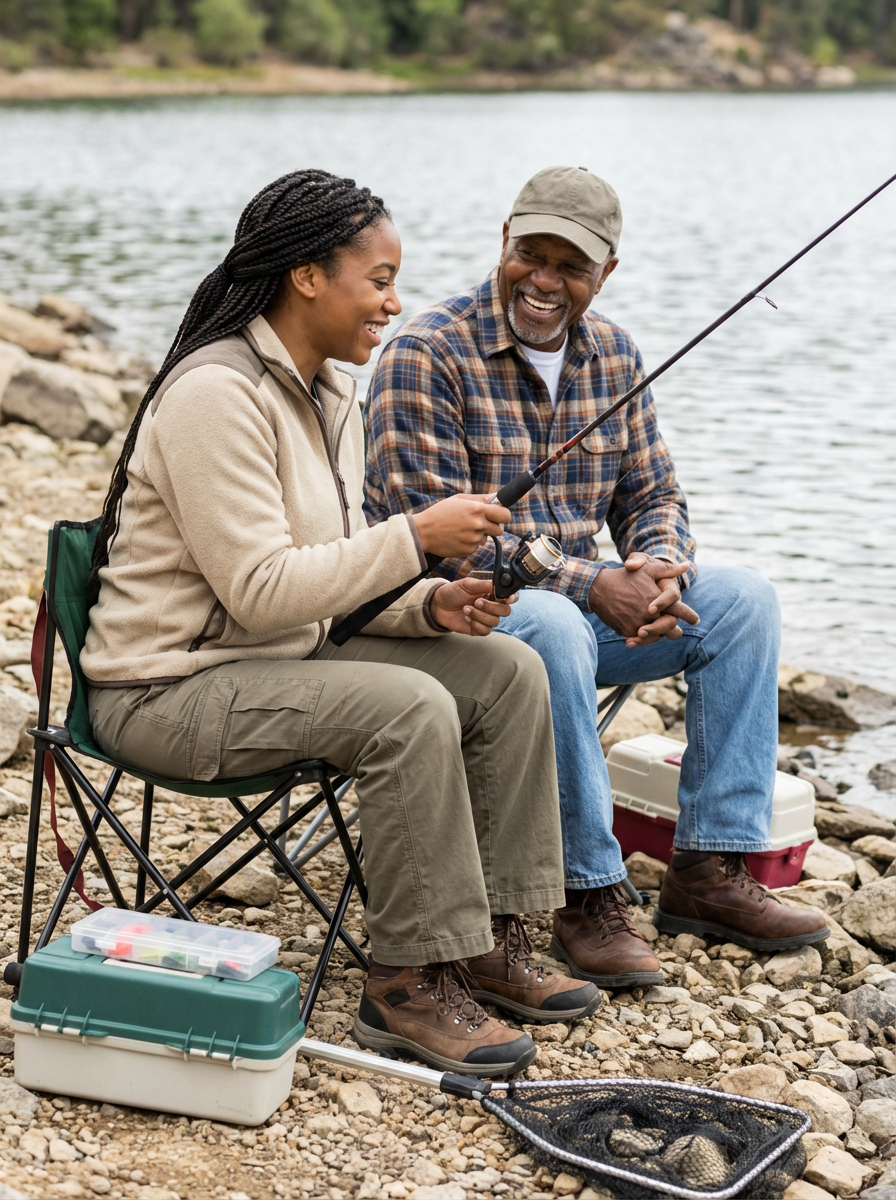 model at fishing spot, father-child bonding, casual outdoor gear, lake or river setting