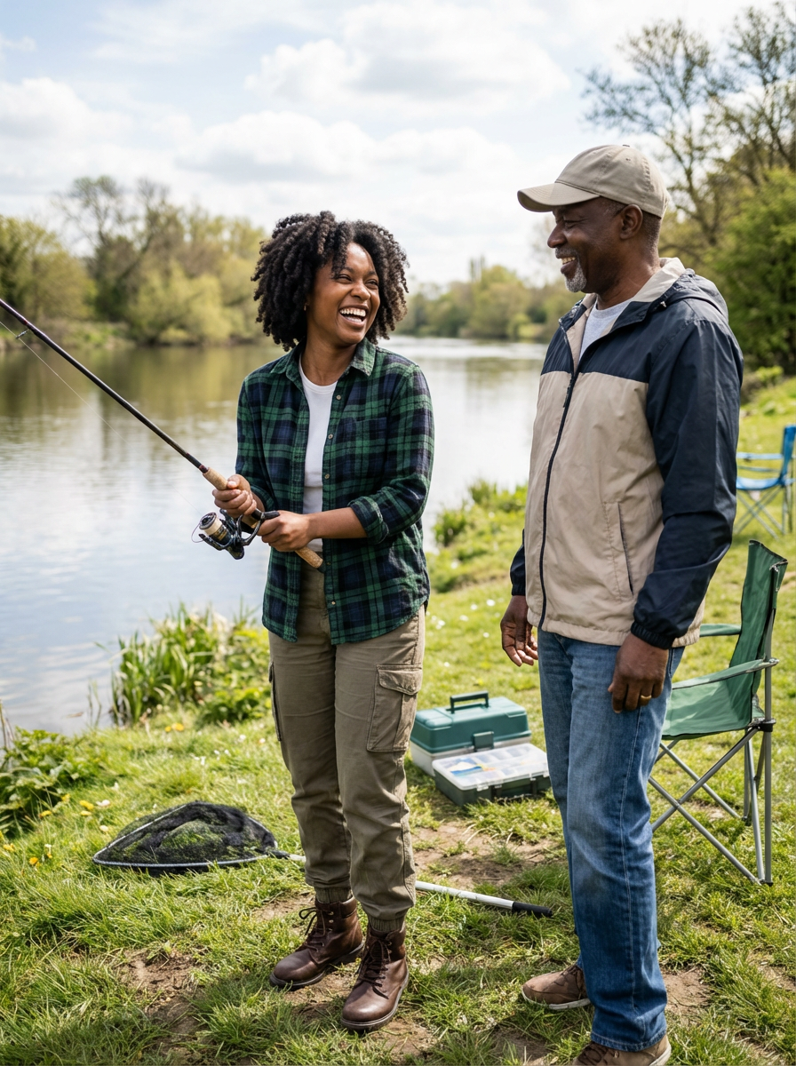 model at fishing spot, father-child bonding, casual outdoor gear, lake or river setting