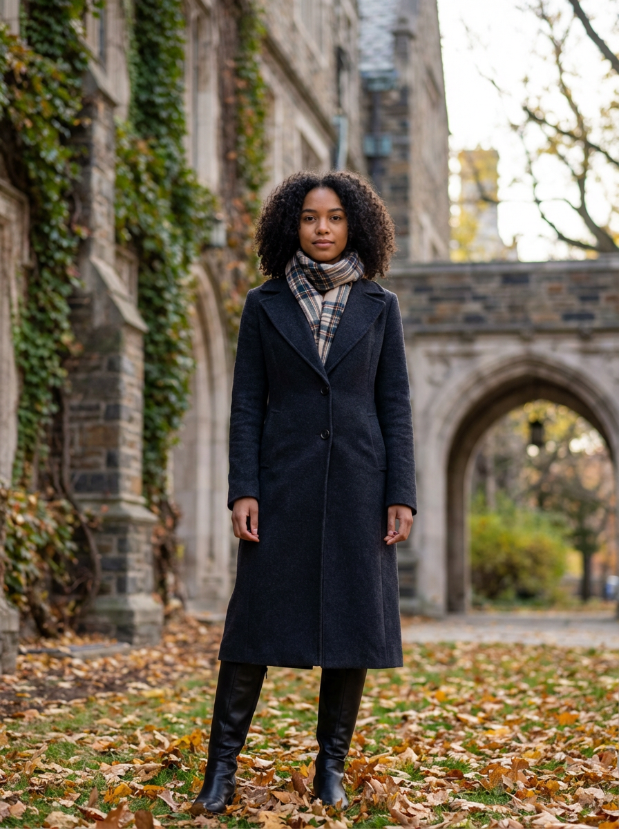 model at gothic university, dark academia fashion, wool coat, scarf, autumn leaves, old stone buildings