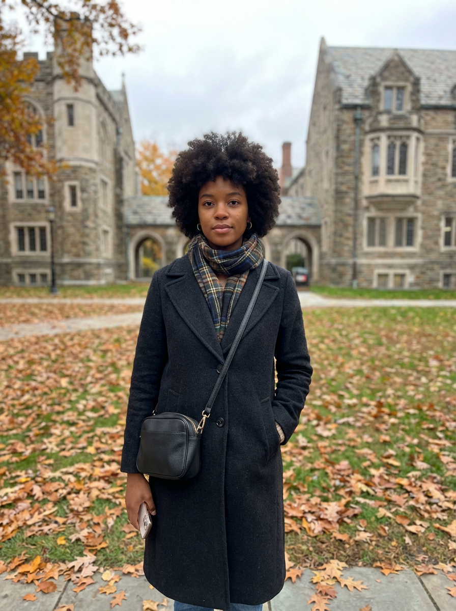 model at gothic university, dark academia fashion, wool coat, scarf, autumn leaves, old stone buildings