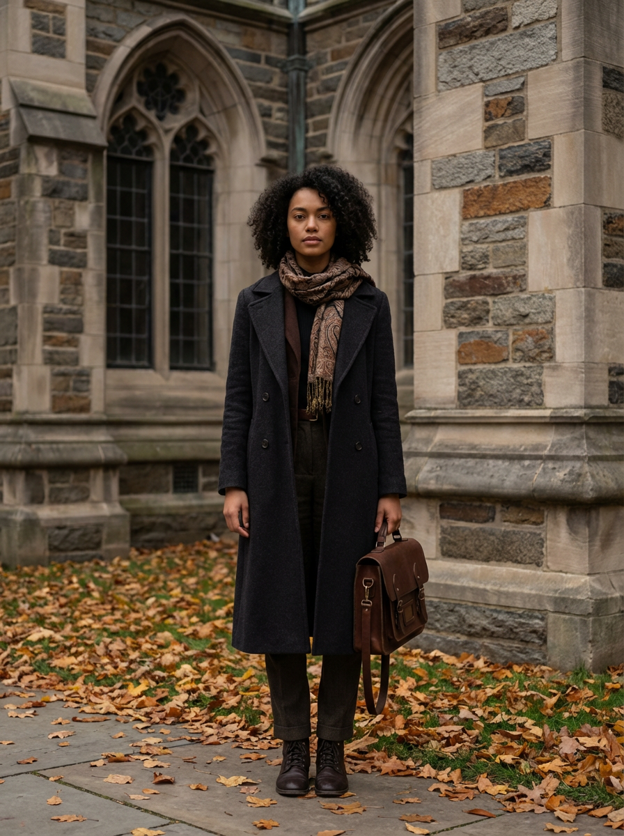 model at gothic university, dark academia fashion, wool coat, scarf, autumn leaves, old stone buildings