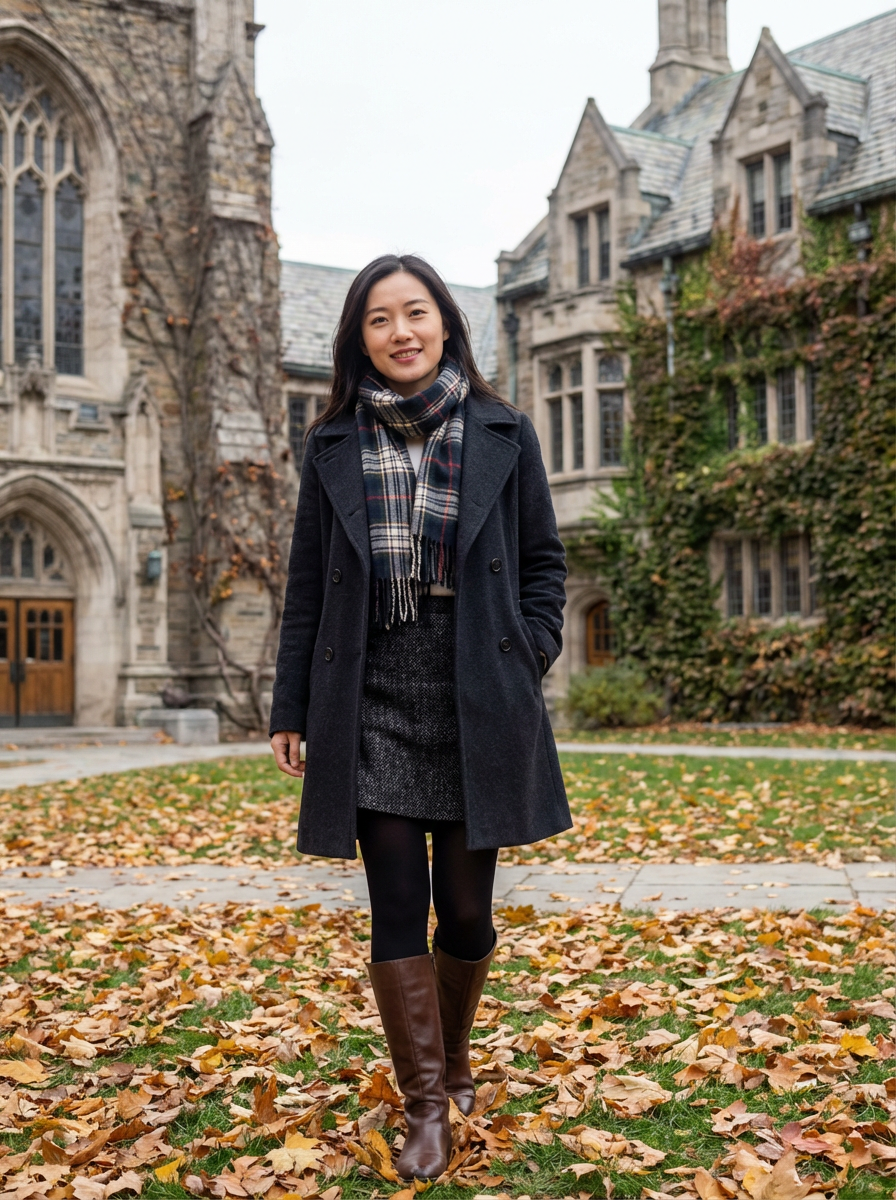 model at gothic university, dark academia fashion, wool coat, scarf, autumn leaves, old stone buildings
